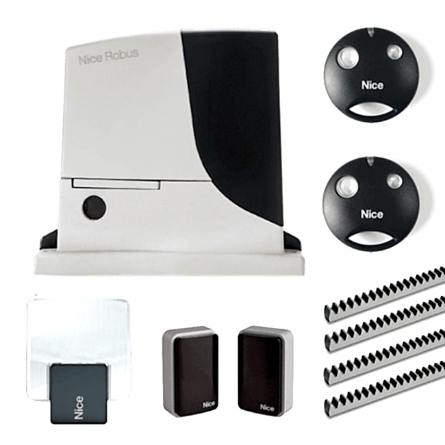 Kit İçeriği: Nice Rox 600 motor, 2 adet kumanda, emniyet fotoseli, flaşör, 4 metre kremayer dişli, bağlantı aparatları.